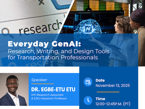 The first session, “Finding Information,” focused on using free GenAI tools to quickly find transportation data and information. SJSU Professor Egbe-Etu Etu, an expert in transportation data analytics, shared strategies for asking the right questions (“prompt engineering,” in AI-speak) and validating results. The session explored how GenAI can empower transportation professionals at every level to work more efficiently and make better data-driven decisions.