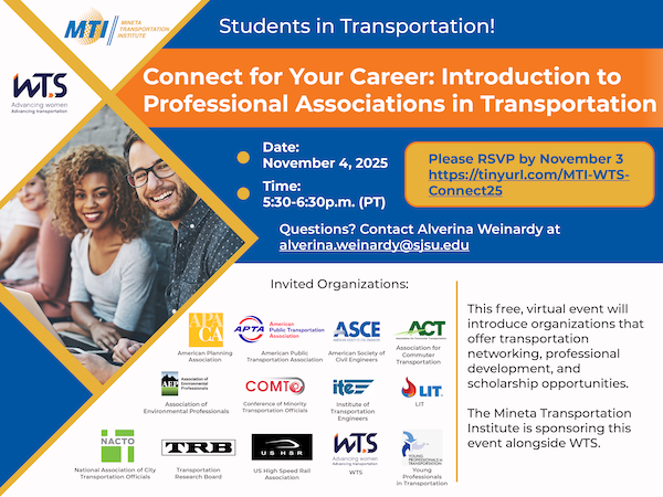WTS-SF Bay Area and MTI hosted this free virtual event "Connect for Your Career: An Introduction to Professional Associations in Transportation" that introduced university students and emerging professionals to transportation organizations that offer networking, professional development opportunities, and/or scholarship opportunities.